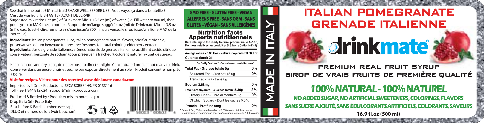The Drinkmate Pomegranate Premium Italian Syrup is manufactured in Italy with the following qualities: