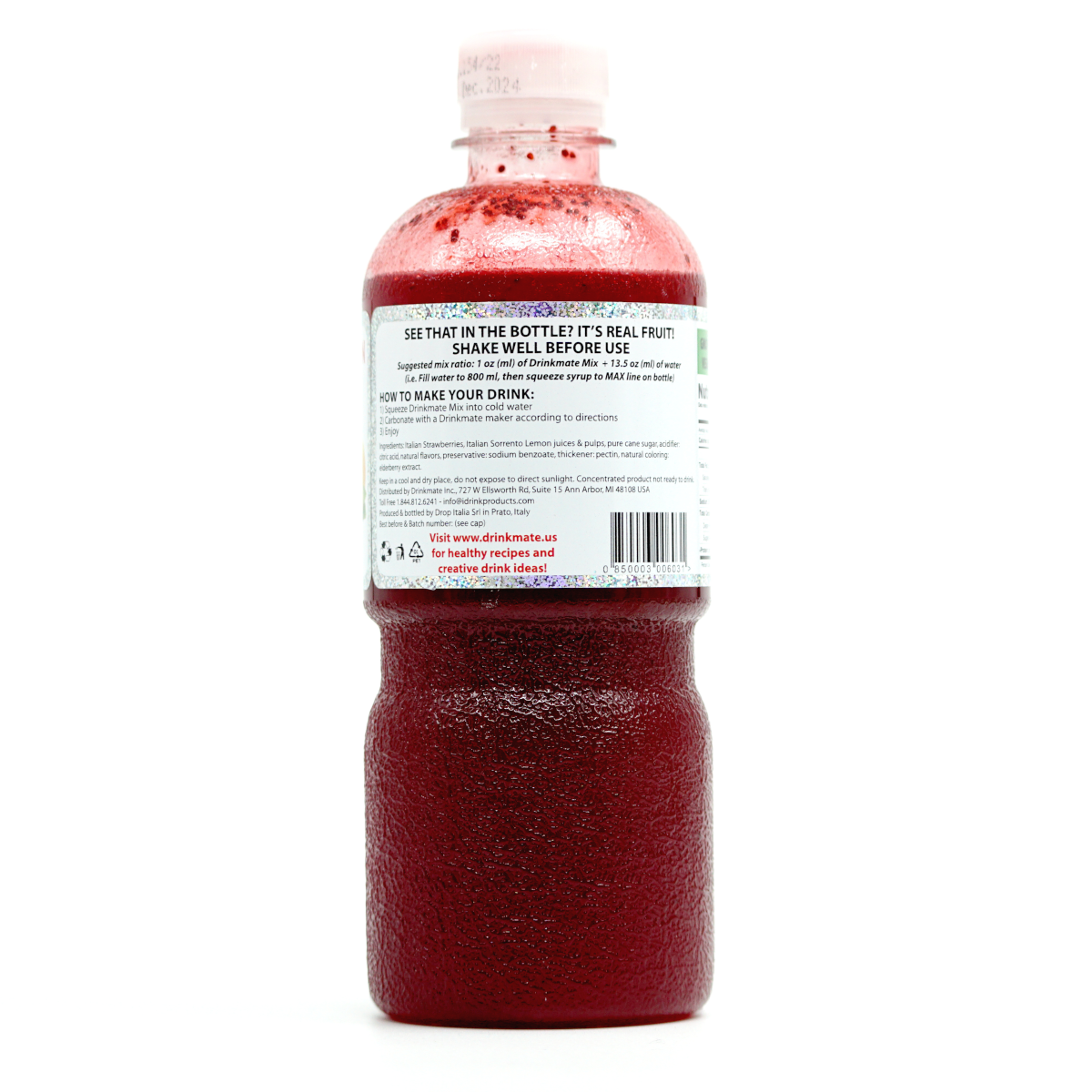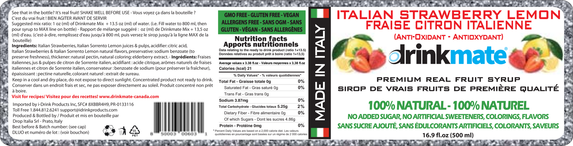 The Drinkmate Strawberry Lemon Premium Italian Syrup is manufactured in Italy with the following qualities: